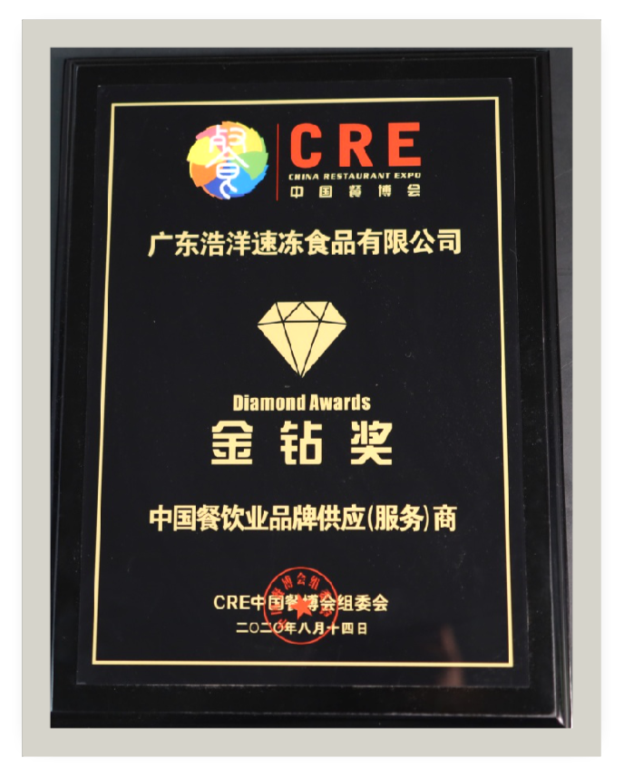 2020,浩洋食品”獲得中國餐飲業(yè)品牌供應商 “金鉆獎 ”。